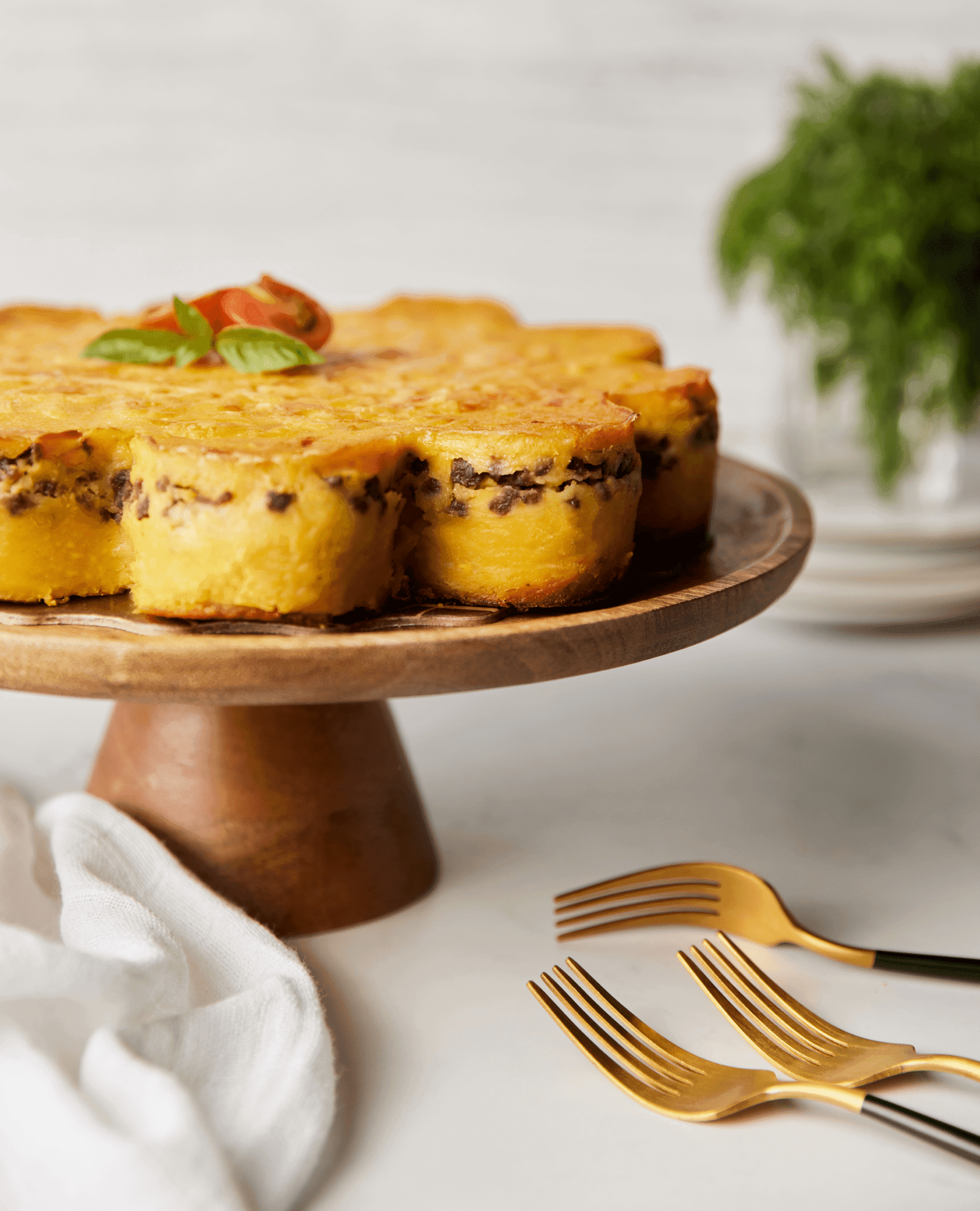 Base de choclo, aderezo de ají amarillo y cebolla blanca, relleno con carne jugosa y cubierto con queso mozzarella y parmesano al horno.
