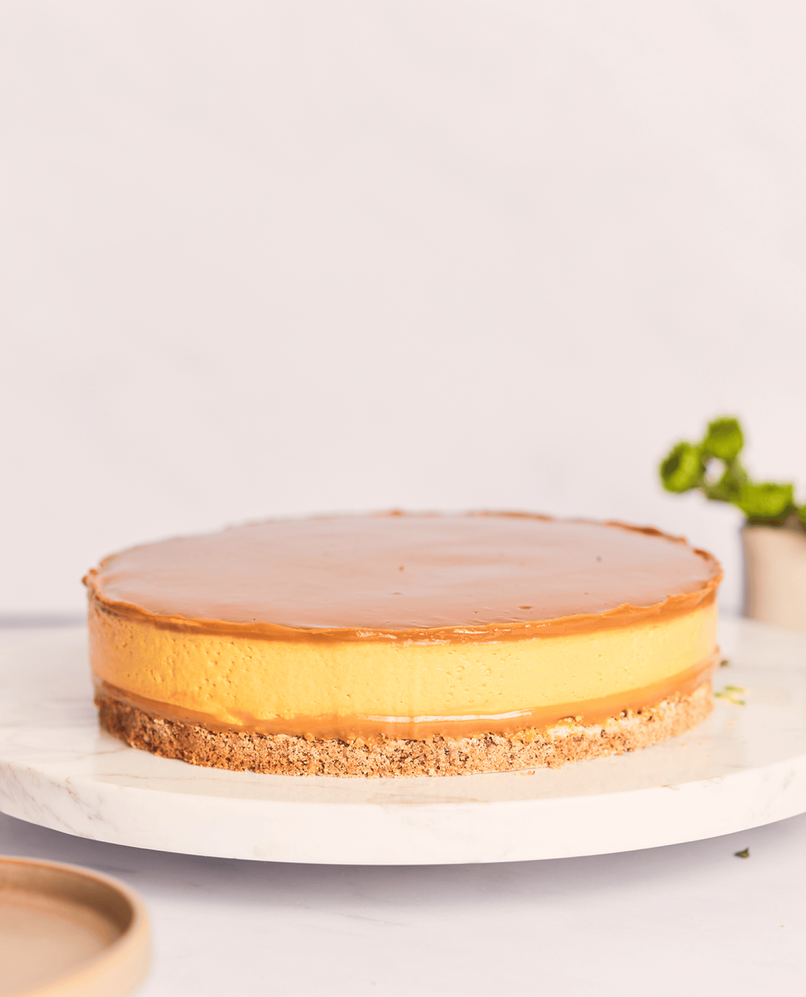Base de un amelcochado de pecanas, relleno de mousse de lúcuma y cubierto con manjar de olla.