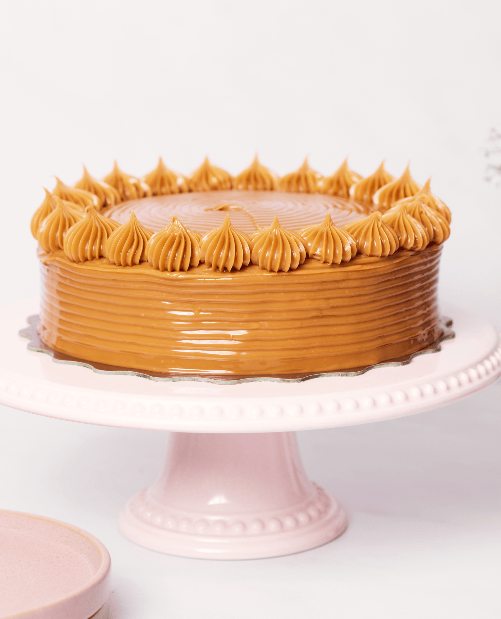 Torta de vainilla esponjosa y húmeda rellena y cubierta de manjar de olla.