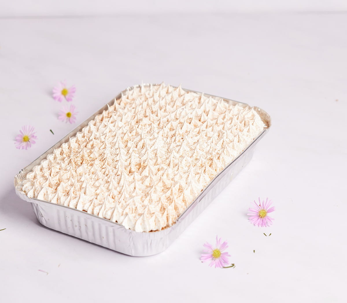 Bizcocho de vainilla, embebido de 4 leches y decorado con merengue italiano.